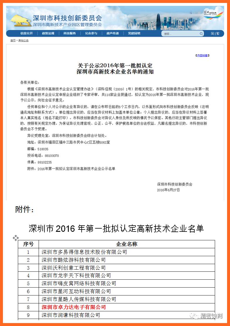 公司2016年11月15日被認定為高新技術認證企業。并獲得由深圳市科技創新委員會、深圳市財政委員會、深圳市稅務局、深圳市地方稅務局聯合頒發的《高新技術企業證書》,證書編號:GR201644200315。